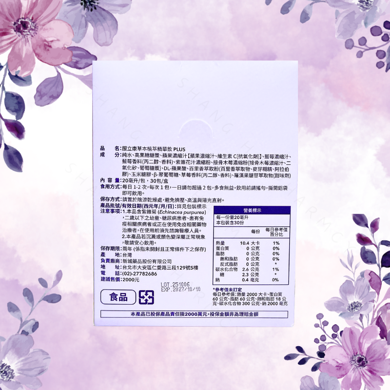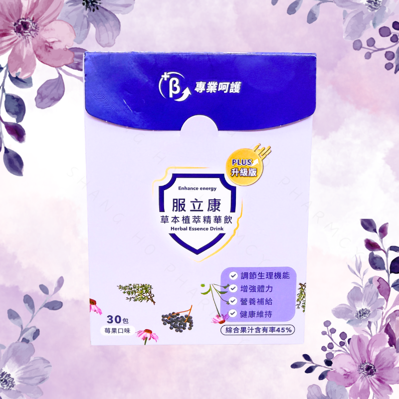 服立康 草本植萃精華飲(PLUS升級版) 草本升級配方,幫助您調節生理機能、補充元氣、維持健康狀態! 📌 產品特色: 🔹綜合果汁含量高達45%,口感清爽莓果風味 🔹草本植萃精華,日常補養首選 🔹調節生理機能、增強體力、營養補給、健康維持 🔹專業升級配方,第三方檢驗合格 🔹隨身即飲設計,方便好攜帶 📅 食用方法: 🔹日常保健:每日1包 🔹加強保護:每日2包(早晚各1包) 📦 規格:20ml x 30包/盒 📍 口味:莓果口味
